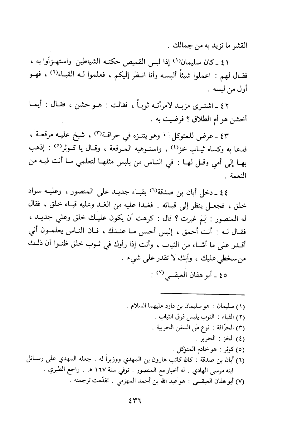 44- دخل أبان بن صدقة «6» بقباء جديد على المنصور، وعليه سواد خلق، فجعل ينظر إلى قبائه. فغدا عليه من الغد وعليه قباء خلق، فقال له المنصور: لم غيرت؟ قال: كرهت أن يكون عليك خلق وعلي جديد، فقال له: أنت أحمق، إلبس أحسن ما عندك، فان الناس يعلمون أني أقدر على ما أشاء من الثياب، وأنت إذا رأوك في ثوب خلق ظنوا أن ذلك من سخطي عليك، وأنك لا تقدر على شيء.