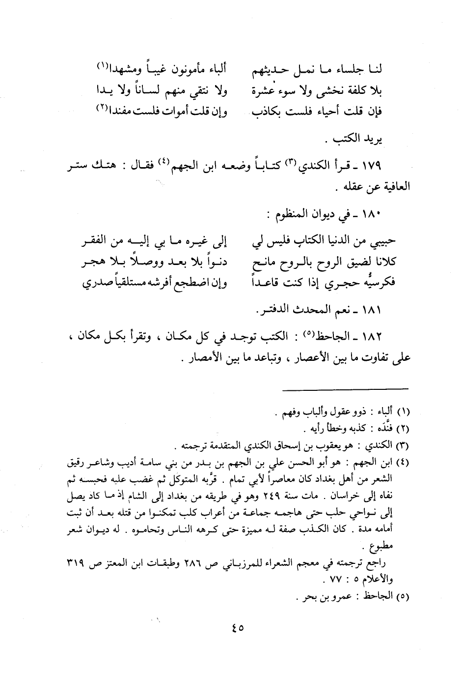 179- قرأ الكندي «3» كتابا وضعه ابن الجهم «4» فقال: هتك ستر العافية عن عقله.