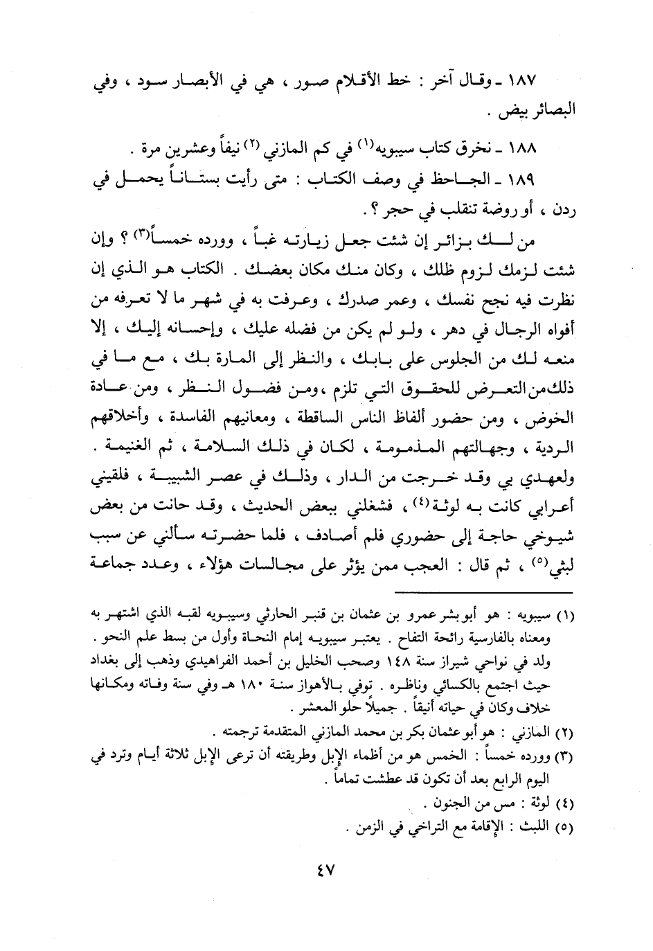 من لك بزائر إن شئت جعل زيارته غبا، وورده خمسا «3» ؟ وإن شئت لزمك لزوم ظلك، وكان منك مكان بعضك. الكتاب هو الذي إن نظرت فيه نجح نفسك، وعمر صدرك، وعرفت به في شهر ما لا تعرفه من أفواه الرجال في دهر، ولو لم يكن من فضله عليك، وإحسانه إليك، إلا منعه لك من الجلوس على بابك، والنظر إلى المارة بك، مع ما في ذلك من التعرض للحقوق التي تلزم، ومن فضول النظر، ومن عادة الخوض، ومن حضور ألفاظ الناس الساقطة، ومعانيهم الفاسدة، وأخلاقهم الردية، وجهالتهم المذمومة، لكان في ذلك السلامة، ثم الغنيمة.