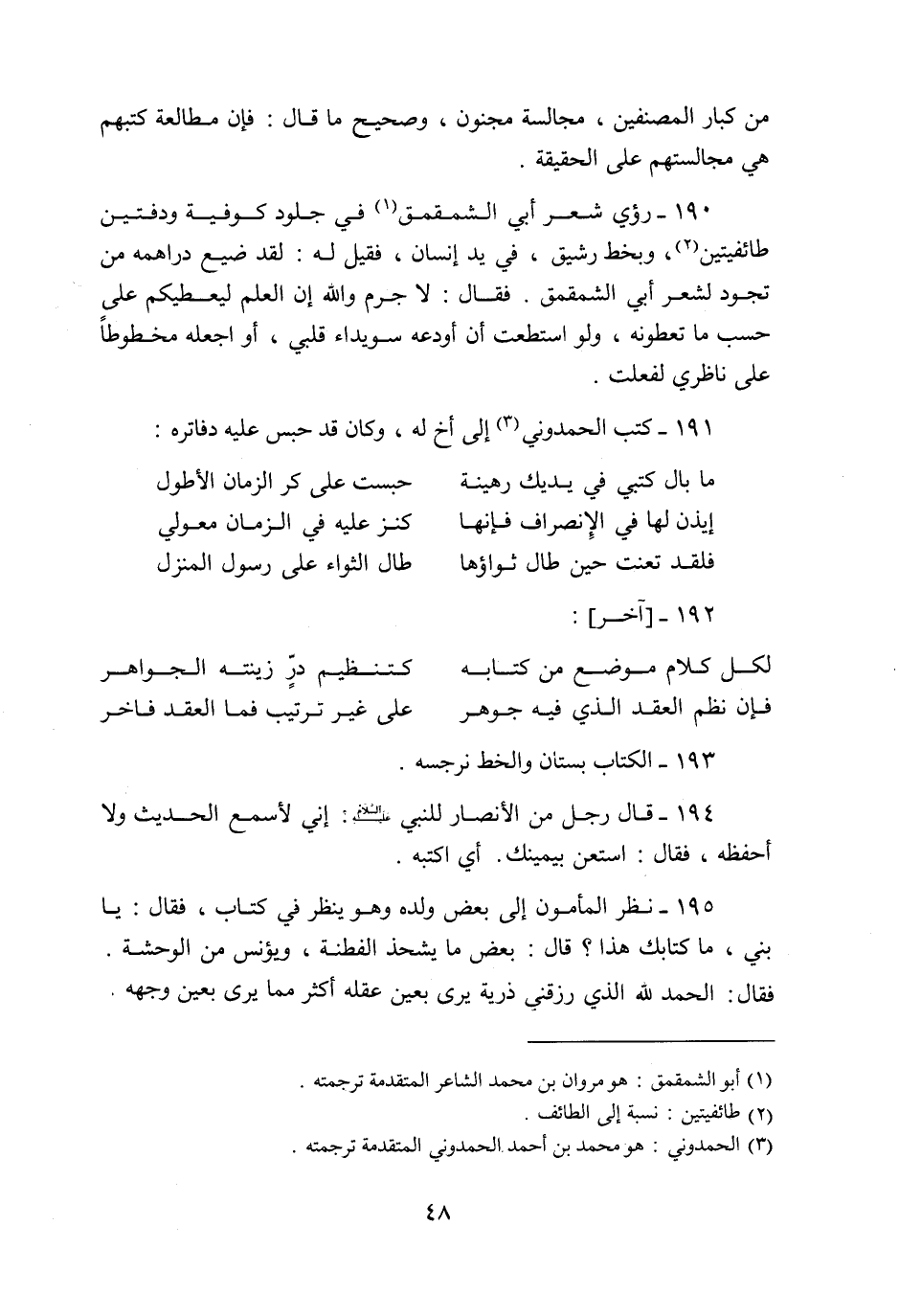 190- رؤي شعر أبي الشمقمق «1» في جلود كوفية ودفتين طائفيتين «2» ، وبخط رشيق، في يد إنسان، فقيل له: لقد ضيع دراهمه من تجود لشعر أبي الشمقمق. فقال: لا جرم والله إن العلم ليعطيكم على حسب ما تعطونه، ولو استطعت أن أودعه سويداء قلبي، أو اجعله مخطوطا على ناظري لفعلت.