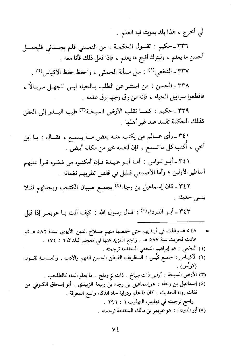 337- النخعي «1» : سل مسألة الحمقى، واحفظ حفظ الأكياس «2» .