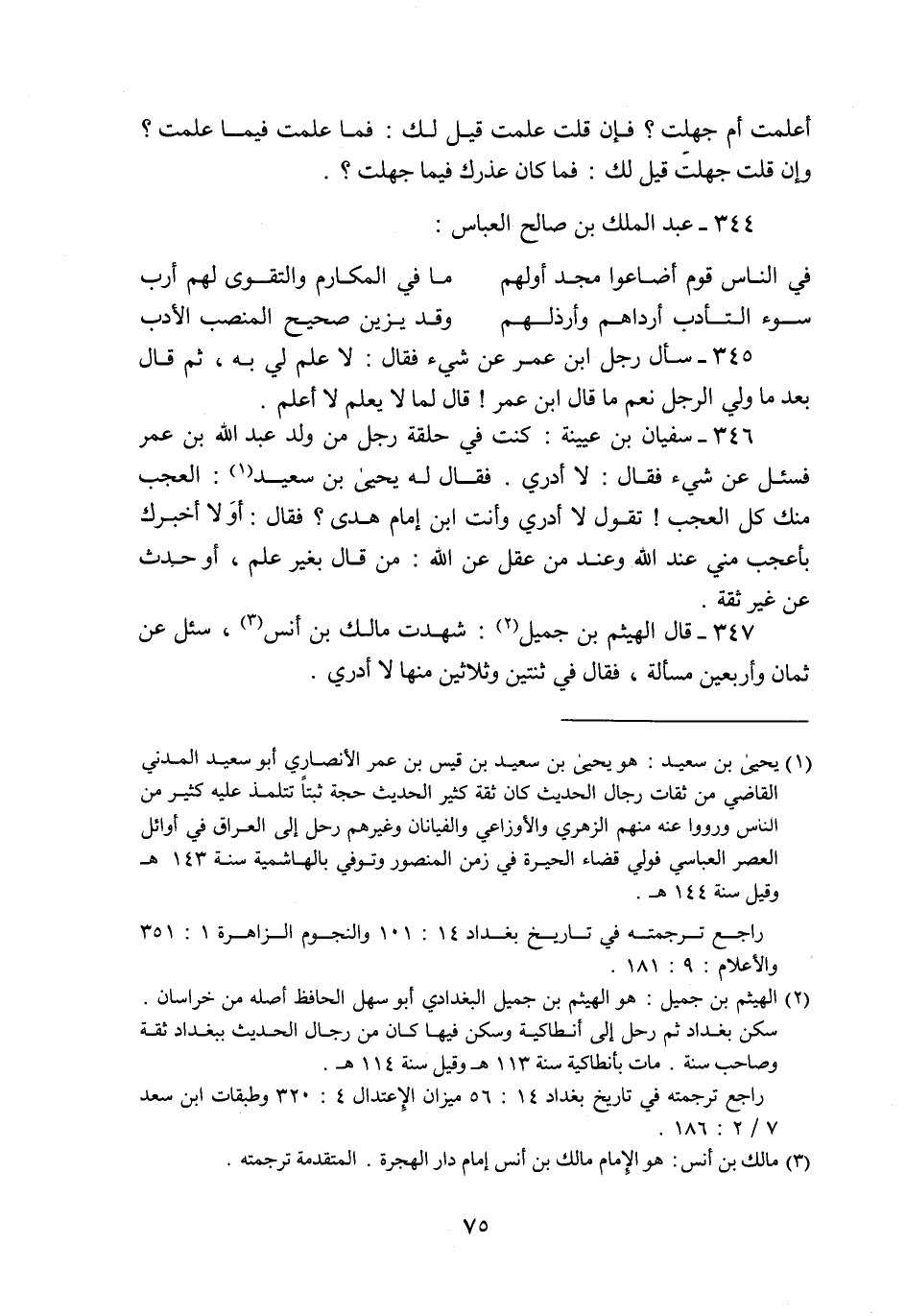 346- سفيان بن عيينة: كنت في حلقة رجل من ولد عبد الله بن عمر فسئل عن شيء فقال: لا أدري. فقال له يحيى بن سعيد «1» : العجب منك كل العجب! تقول لا أدري وأنت ابن إمام هدى؟ فقال: أولا أخبرك بأعجب مني عند الله وعند من عقل عن الله: من قال بغير علم، أو حدث عن غير ثقة.