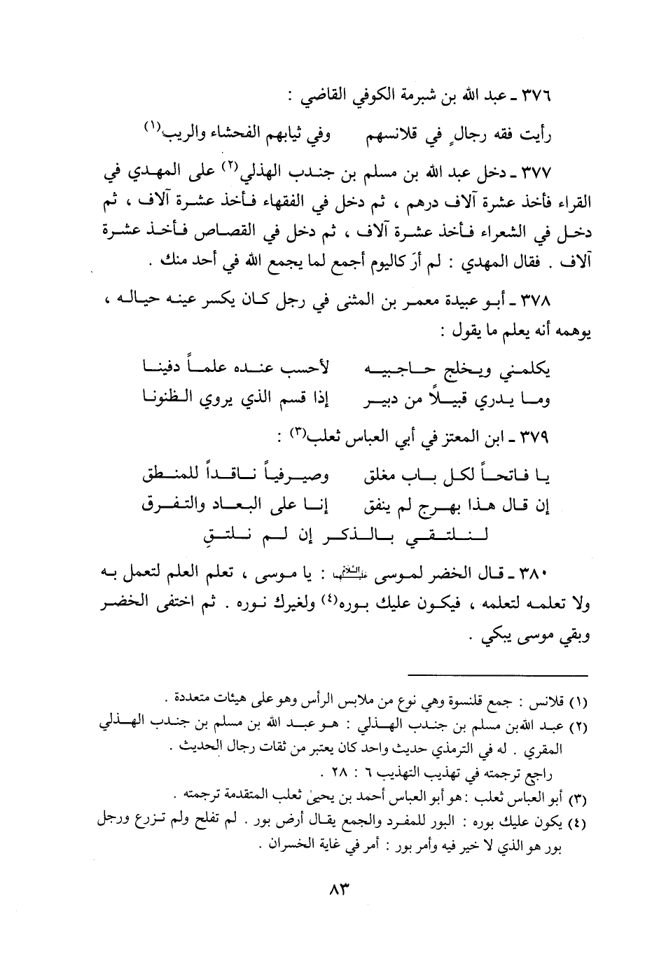 377- دخل عبد الله بن مسلم بن جندب الهذلي «2» على المهدي في القراء فأخذ عشرة آلاف درهم، ثم دخل في الفقهاء فأخذ عشرة آلاف، ثم دخل في الشعراء فأخذ عشرة آلاف، ثم دخل في القصاص فأخذ عشرة آلاف. فقال المهدي: لم أر كاليوم أجمع لما يجمع الله في أحد منك.