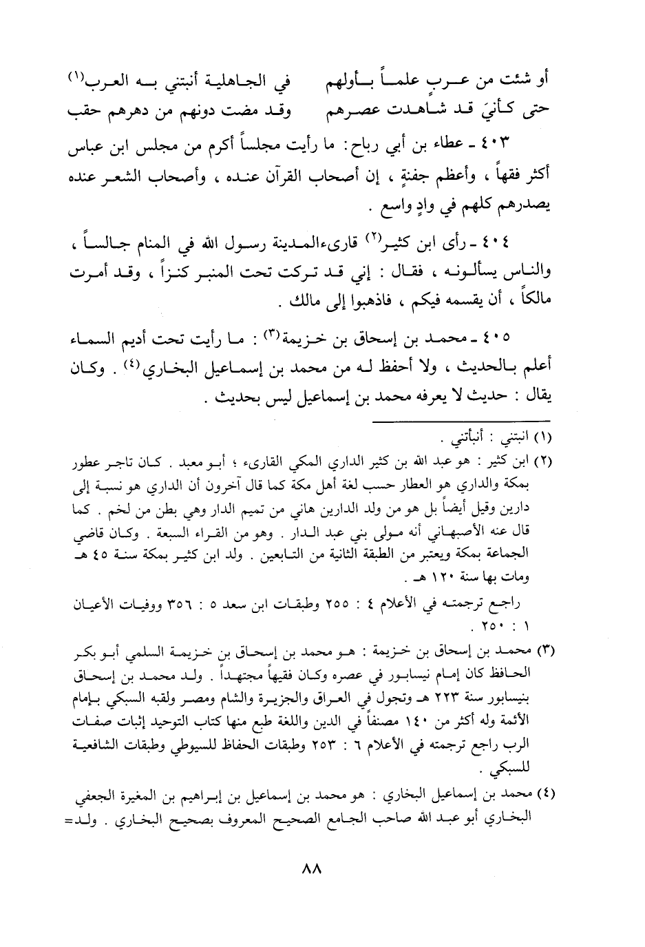 405- محمد بن إسحاق بن خزيمة «3» : ما رأيت تحت أديم السماء أعلم بالحديث، ولا أحفظ له من محمد بن إسماعيل البخاري «4» . وكان يقال: حديث لا يعرفه محمد بن إسماعيل ليس بحديث.