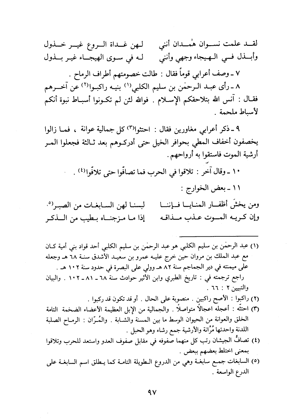 9- ذكر أعرابي مغاورين فقال: احتثوا «3» كل جمالية عوانة، فما زالوا يخصفون أخفاف المطي بحوافر الخيل حتى أدركوهم بعد ثالثة فجعلوا المر أرشية الموت فاستقوا به أرواحهم.