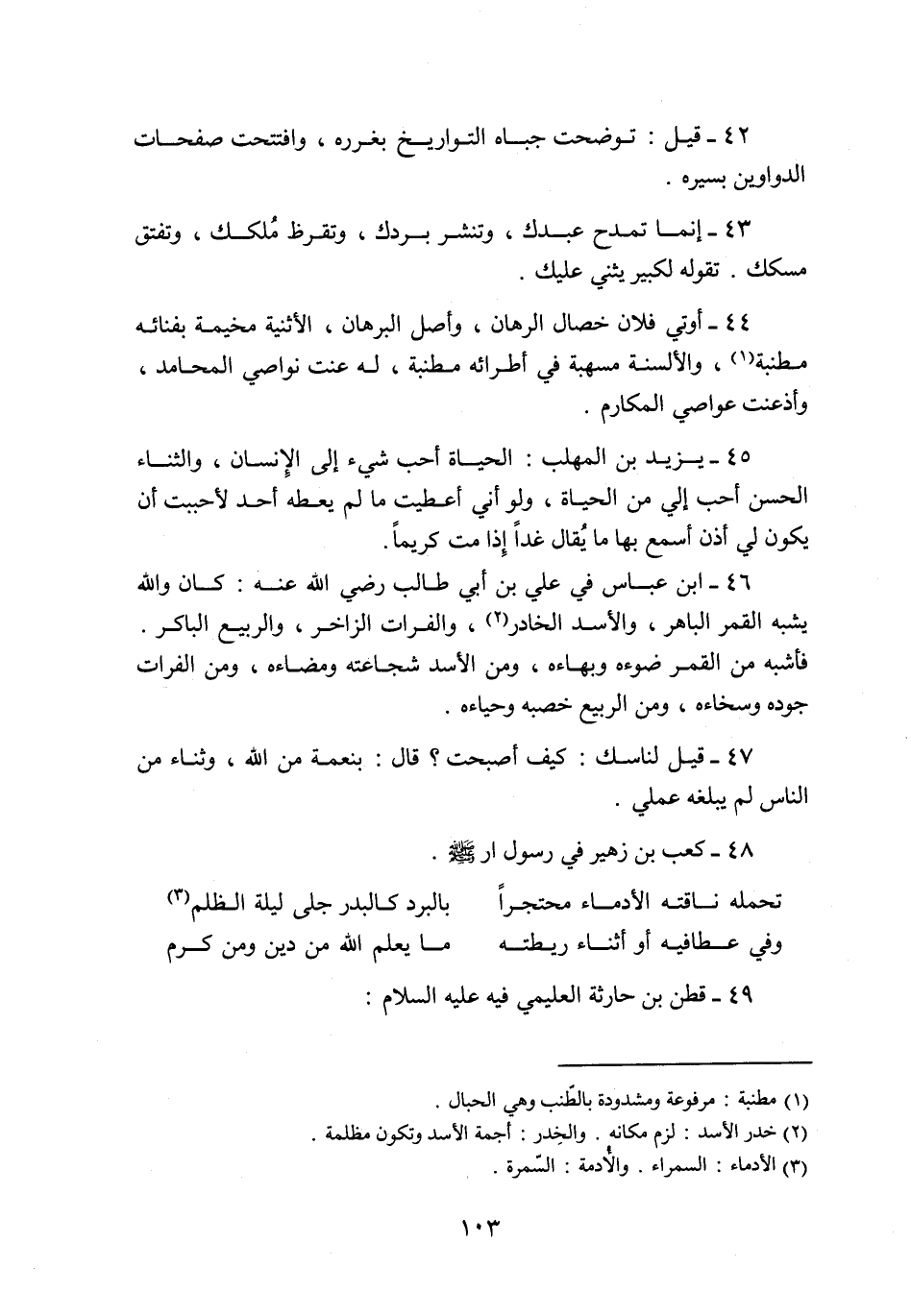 42- قيل: توضحت جباه التواريخ بغرره، وافتتحت صفحات الدواوين بسيره.