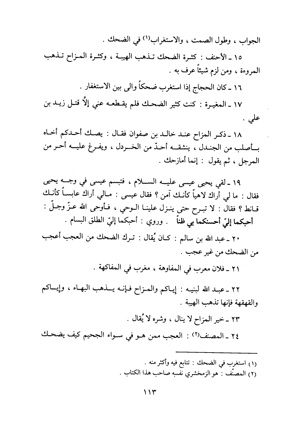 18- ذكر المزاح عند خالد بن صفوان فقال: يصك أحدكم أخاه بأصلب من الجندل، ينشقه أحدّ من الخردل، ويفرغ عليه أحر من المرجل، ثم يقول: إنما أمازحك.