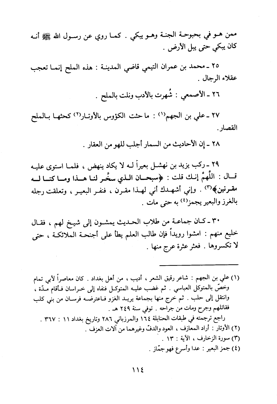 30- كان جماعة من طلاب الحديث يمشون إلى شيخ لهم، فقال خليع منهم: امشوا رويدا فإن طالب العلم يطأ على أجنحة الملائكة، حتى لا تكسروها. فعثر عثرة عرج منها.