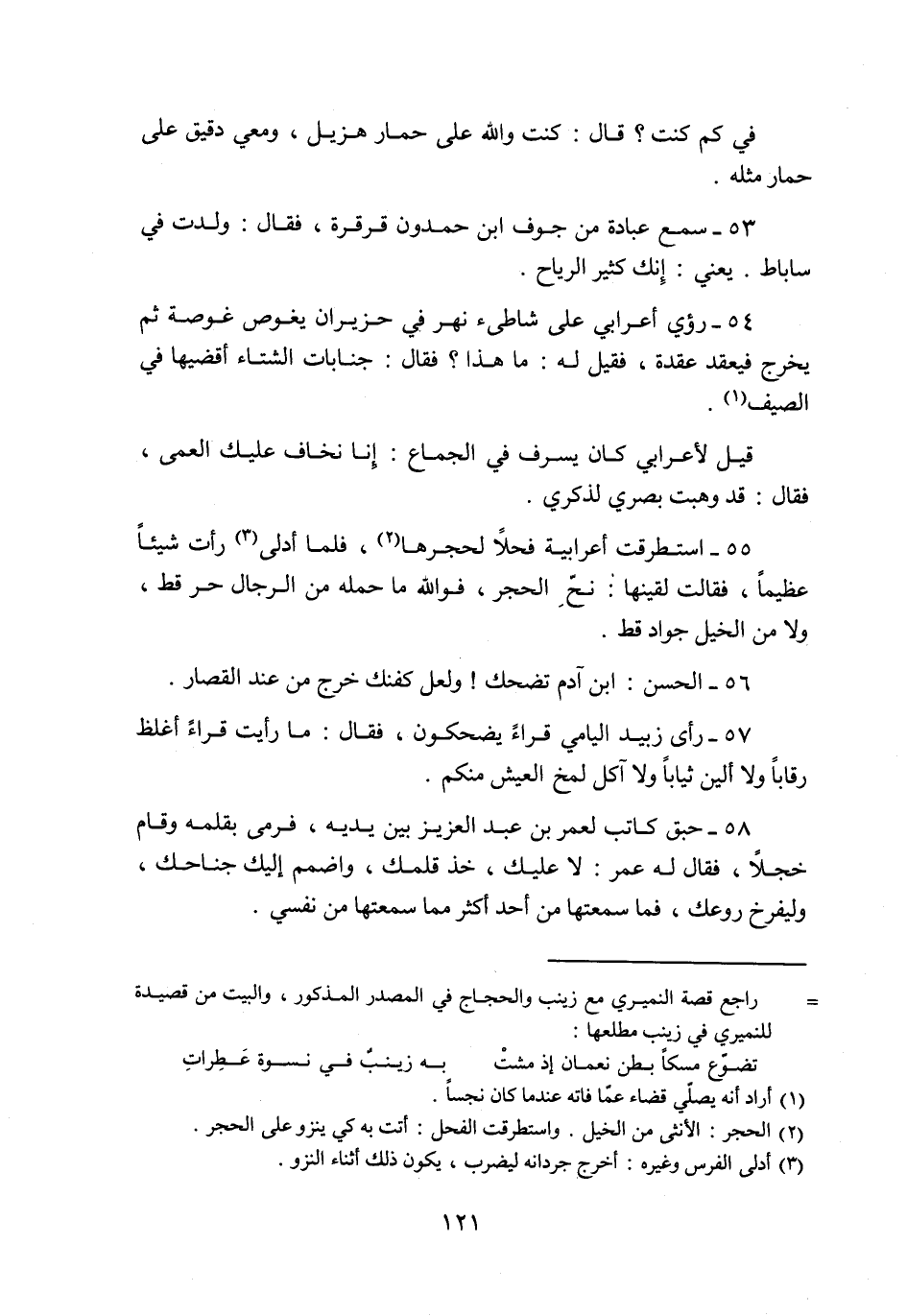 55- استطرقت أعرابية فحلا لحجرها «2» ، فلما أدلى «3» رأت شيئا عظيما، فقالت لقينها: نحّ الحجر، فو الله ما حمله من الرجال حر قط، ولا من الخيل جواد قط.