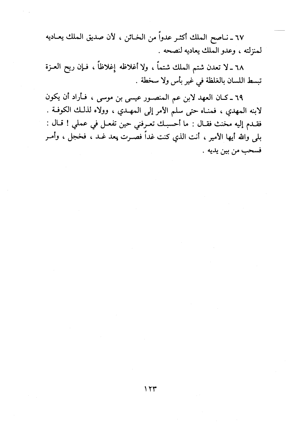 67- ناصح الملك أكثر عدوا من الخائن، لأن صديق الملك يعاديه لمنزلته، وعدو الملك يعاديه لنصحه.