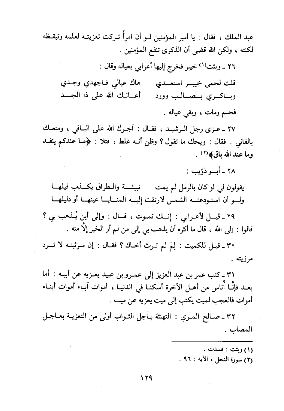 27- عزى رجل الرشيد، فقال: آجرك الله على الباقي، ومتعك بالفاني. فقال: ويحك ما تقول؟ وظن أنه غلط، فتلا: ما عِنْدَكُمْ يَنْفَدُ وَما عِنْدَ اللَّهِ باقٍ