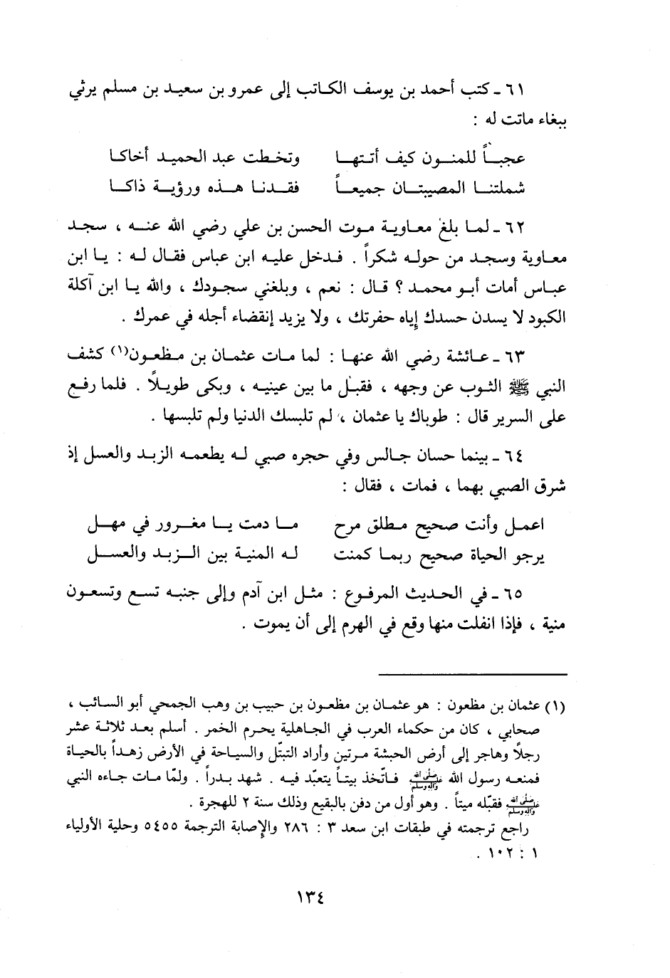 64- بينما حسان جالس وفي حجره صبي له يطعمه الزبد والعسل إذ شرق الصبي بهما، فمات، فقال: