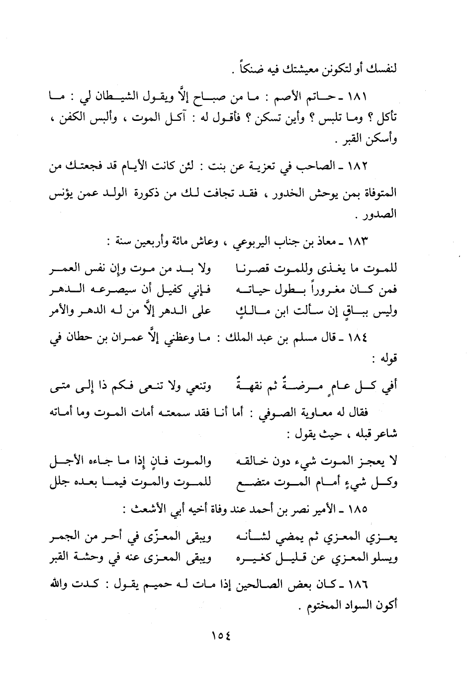 181- حاتم الأصم: ما من صباح إلّا ويقول الشيطان لي: ما تأكل؟ وما تلبس؟ وأين تسكن؟ فأقول له: آكل الموت، وألبس الكفن، وأسكن القبر.