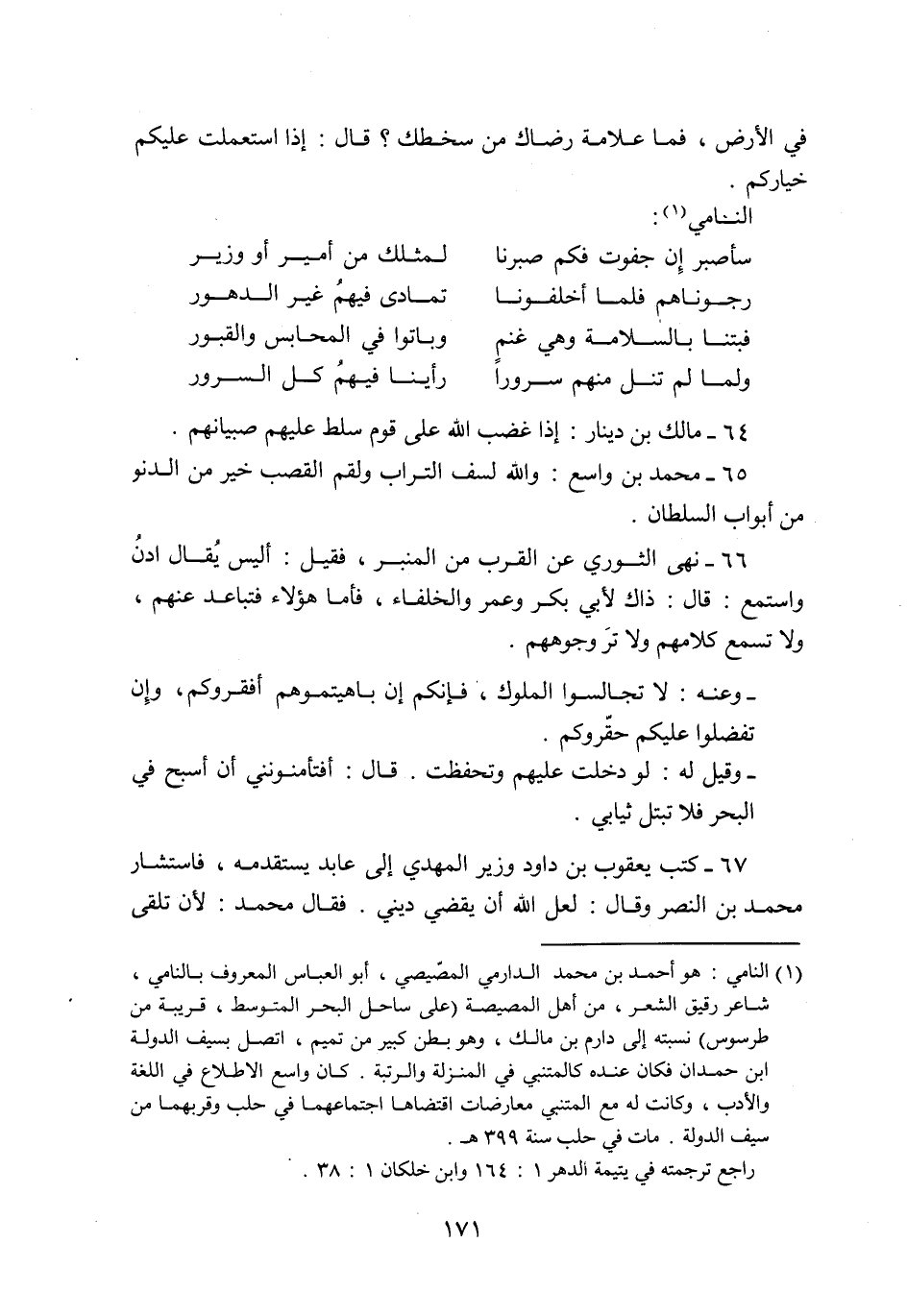67- كتب يعقوب بن داود وزير المهدي إلى عابد يستقدمه، فاستشار محمد بن النصر وقال: لعل الله أن يقضي ديني. فقال محمد: لأن تلقى