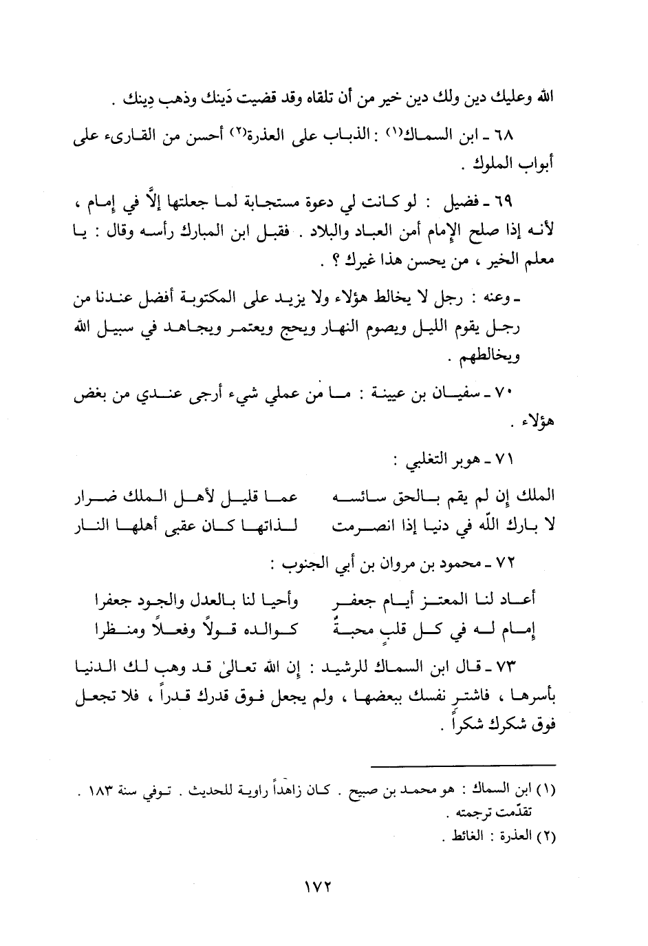 68- ابن السماك «1» : الذباب على العذرة «2» أحسن من القارىء على أبواب الملوك.