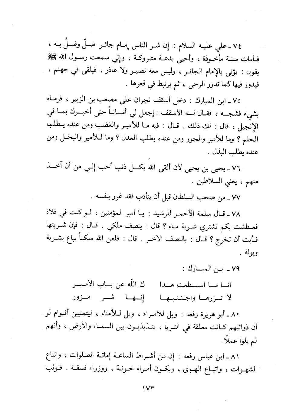 75- ابن المبارك: دخل أسقف نجران على مصعب بن الزبير، فرماه بشيء فشجه، فقال له الأسقف: إجعل لي أمانا حتى أخبرك بما في الإنجيل، قال: لك ذلك. قال: فيه ما للأمير والغضب ومن عنده يطلب الحلم؟ وما للأمير والجور ومن عنده يطلب العدل؟ وما للأمير والبخل ومن عنده يطلب البذل.