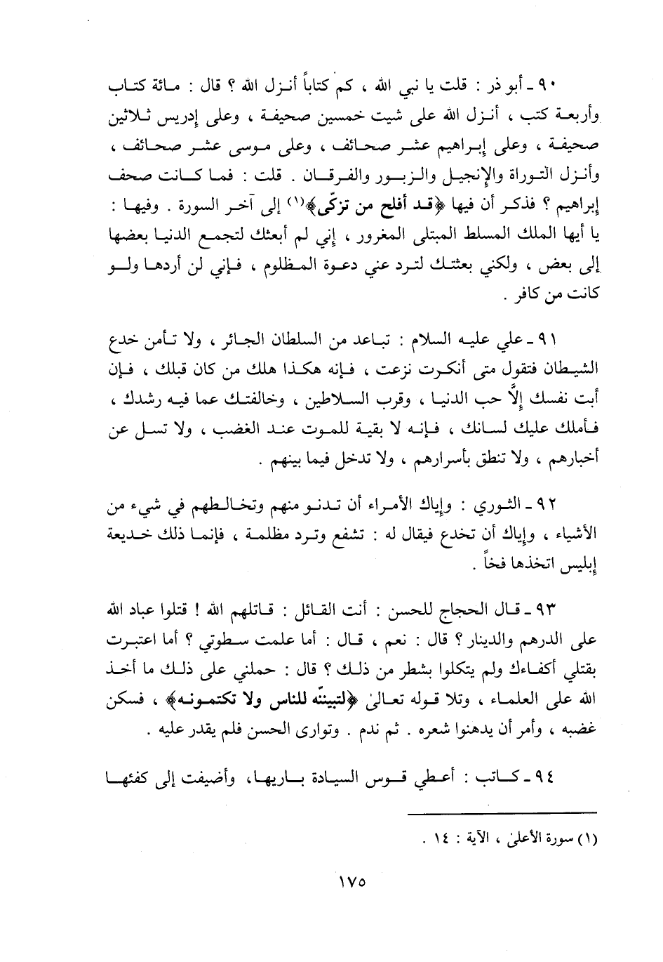 90- أبوذر: قلت يا نبي الله، كم كتابا أنزل الله؟ قال: مائة كتاب وأربعة كتب، أنزل الله على شيت خمسين صحيفة، وعلى إدريس ثلاثين صحيفة، وعلى إبراهيم عشر صحائف، وعلى موسى عشر صحائف، وأنزل التوراة والإنجيل والزبور والفرقان. قلت: فما كانت صحف إبراهيم؟ فذكر أن فيها قَدْ أَفْلَحَ مَنْ تَزَكَّى