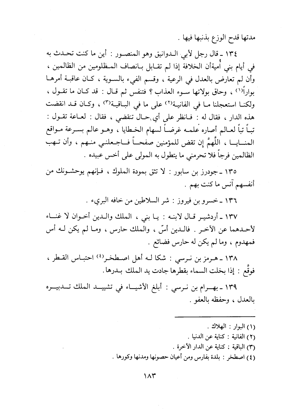 139- بهرام بن نرسي: أبلغ الأشياء في تشييد الملك تدبيره بالعدل، وحفظه بالعفو.