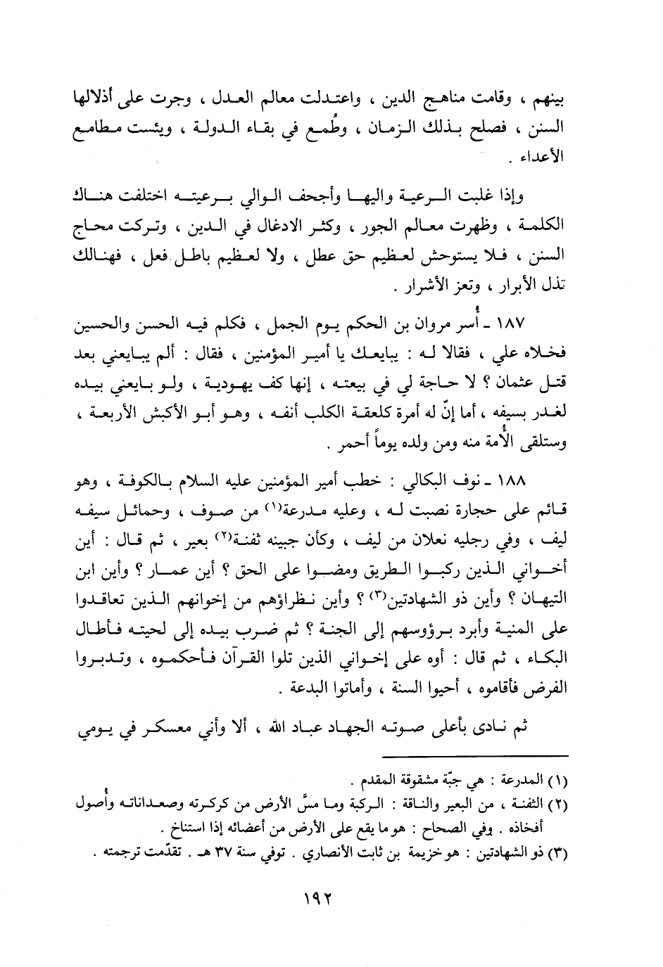 188- نوف البكالي: خطب أمير المؤمنين عليه السلام بالكوفة، وهو قائم على حجارة نصبت له، وعليه مدرعة «1» من صوف، وحمائل سيفه ليف، وفي رجليه نعلان من ليف، وكأن جبينه ثفنة «2» بعير، ثم قال: أين أخواني الذين ركبوا الطريق ومضوا على الحق؟ أين عمار؟ وأين ابن التيهان؟ وأين ذو الشهادتين «3» ؟ وأين نظراؤهم من إخوانهم الذين تعاقدوا على المنية وأبرد برؤوسهم إلى الجنة؟ ثم ضرب بيده إلى لحيته فأطال البكاء، ثم قال: أوه على إخواني الذين تلوا القرآن فأحكموه، وتدبروا الفرض فأقاموه، أحيوا السنة، وأماتوا البدعة.