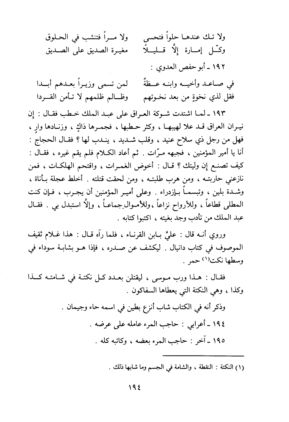 193- لما اشتدت شوكة العراق على عبد الملك خطب فقال: إن نيران العراق قد علا لهيبها، وكثر حطبها، فجمرها ذاك، وزنادها وار، فهل من رجل ذي سلاح عنيد، وقلب شديد، يندب لها؟ فقال الحجاج: