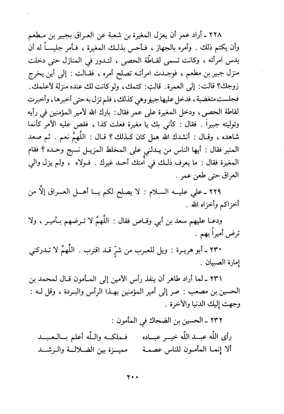 231- لما أراد طاهر أن ينفذ رأس الأمين إلى المأمون قال لمحمد بن الحسين بن مصعب: صر إلى أمير المؤمنين بهذا الرأس والبردة، وقل له: