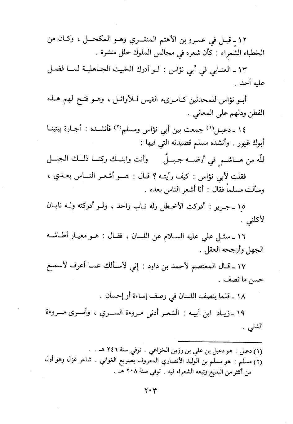 14- دعبل «1» جمعت بين أبي نؤاس ومسلم «2» فأنشده: أجارة بيتينا أبوك غيور. وأنشده مسلم قصيدته التي فيها: