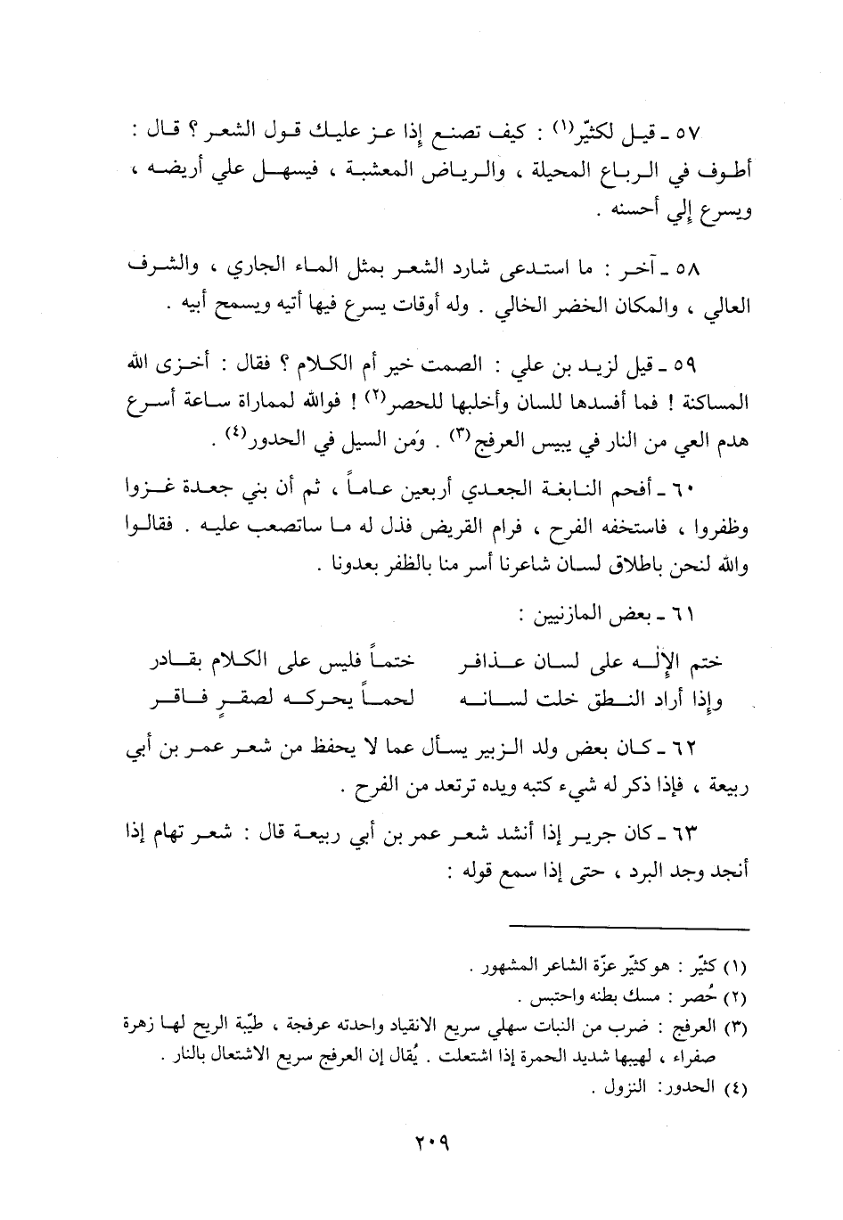 58- آخر: ما استدعى شارد الشعر بمثل الماء الجاري، والشرف العالي، والمكان الخضر الخالي. وله أوقات يسرع فيها أتيه ويسمح أبيه.