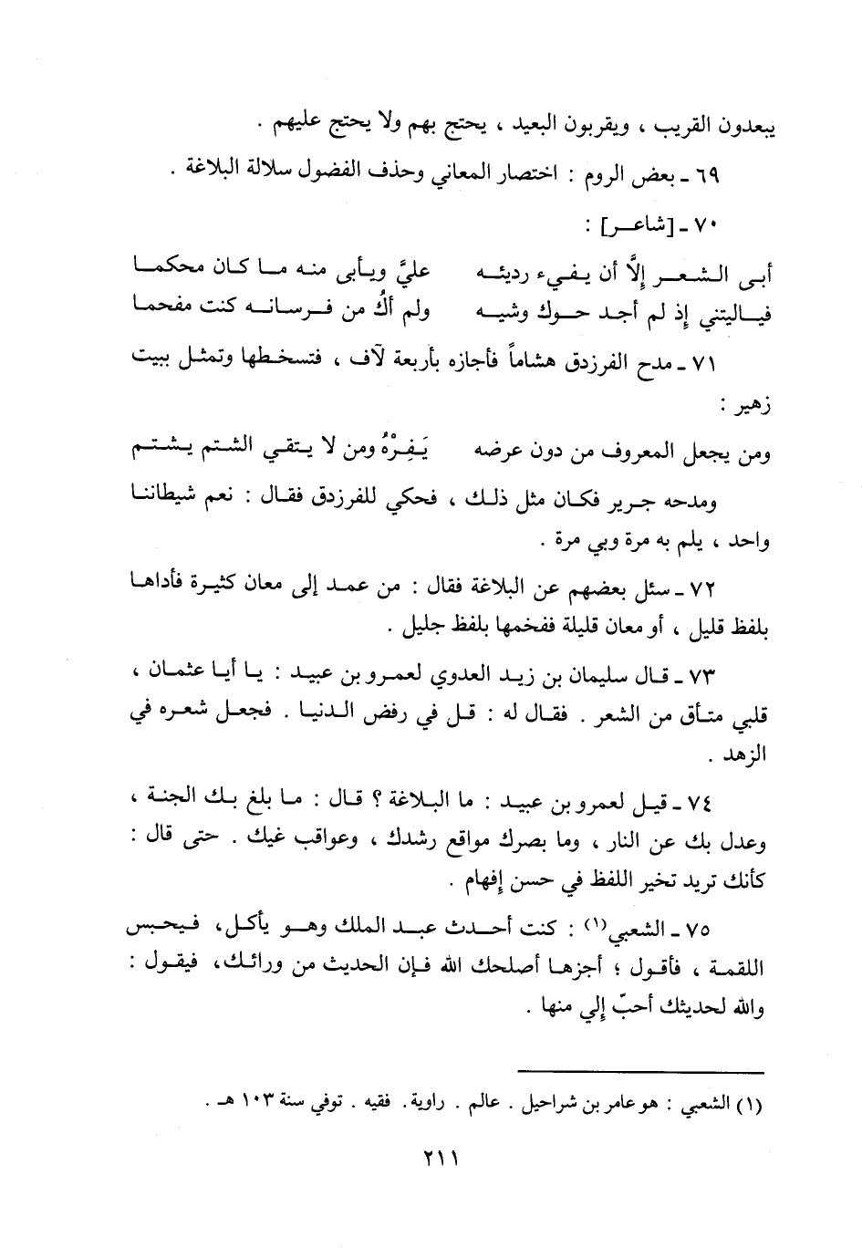 75- الشعبي «1» : كنت أحدث عبد الملك وهو يأكل، فيحبس اللقمة، فأقول؛ أجزها أصلحك الله فإن الحديث من ورائك، فيقول: