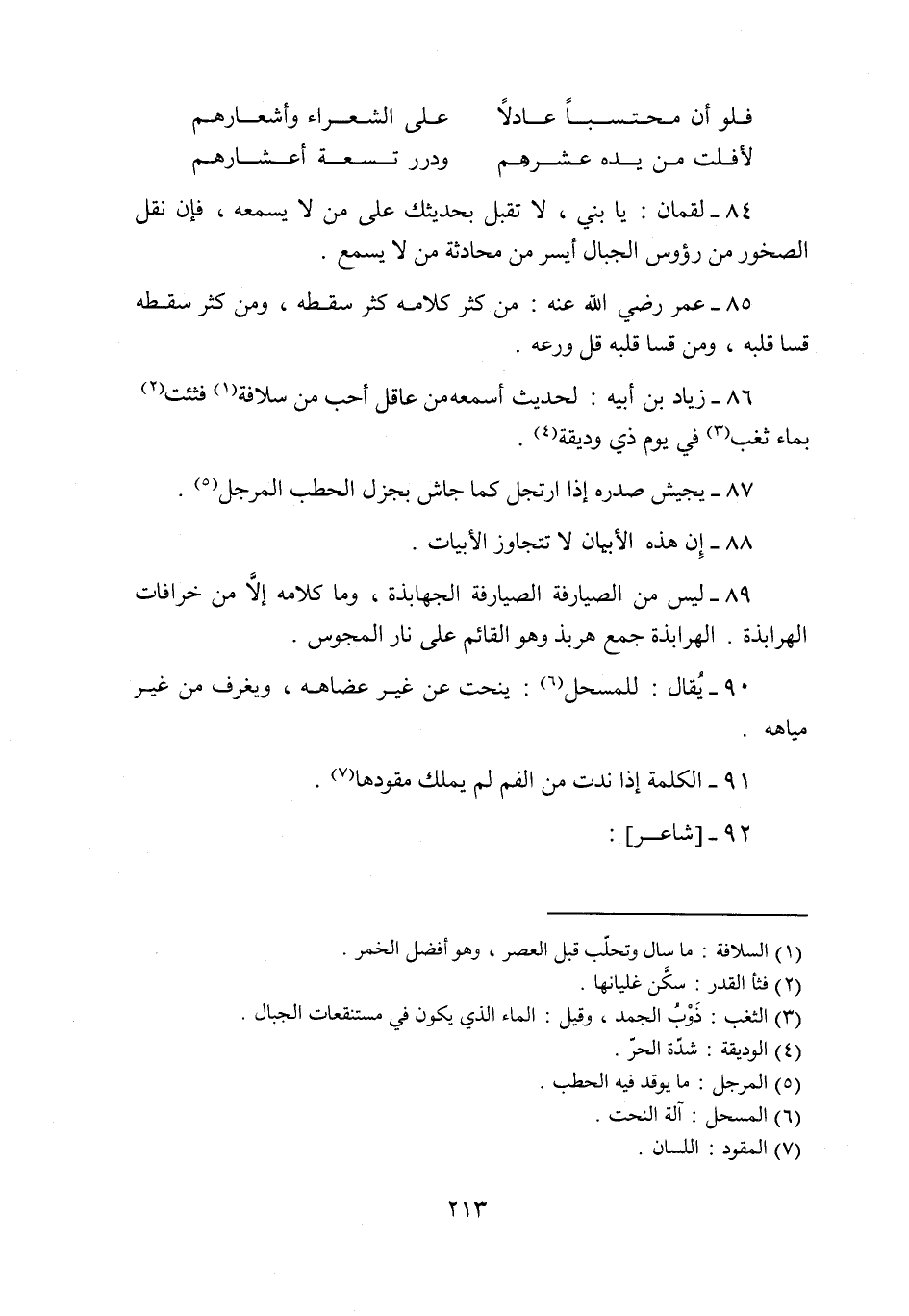90- يقال: للمسحل «6» : ينحت عن غير عضاهه، ويغرف من غير مياهه.