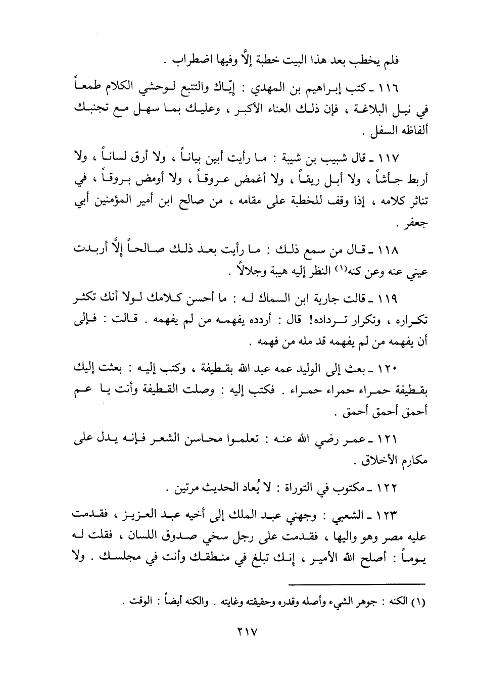 116- كتب إبراهيم بن المهدي: إيّاك والتتبع لوحشي الكلام طمعا في نيل البلاغة، فإن ذلك العناء الأكبر، وعليك بما سهل مع تجنبك ألفاظه السفل.
