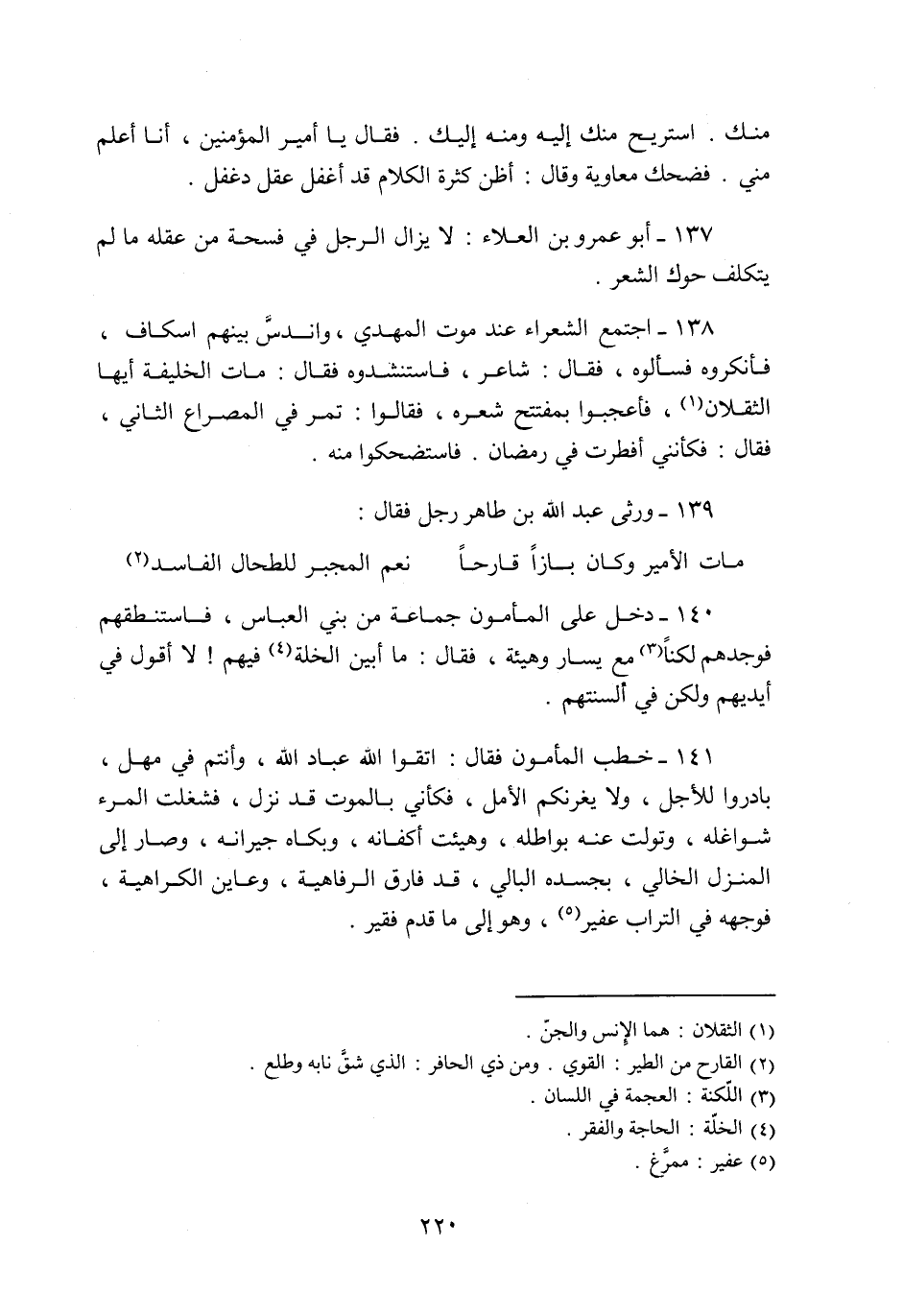 140- دخل على المأمون جماعة من بني العباس، فاستنطقهم فوجدهم لكنا «3» مع يسار وهيئة، فقال: ما أبين الخلة «4» فيهم! لا أقول في أيديهم ولكن في ألسنتهم.