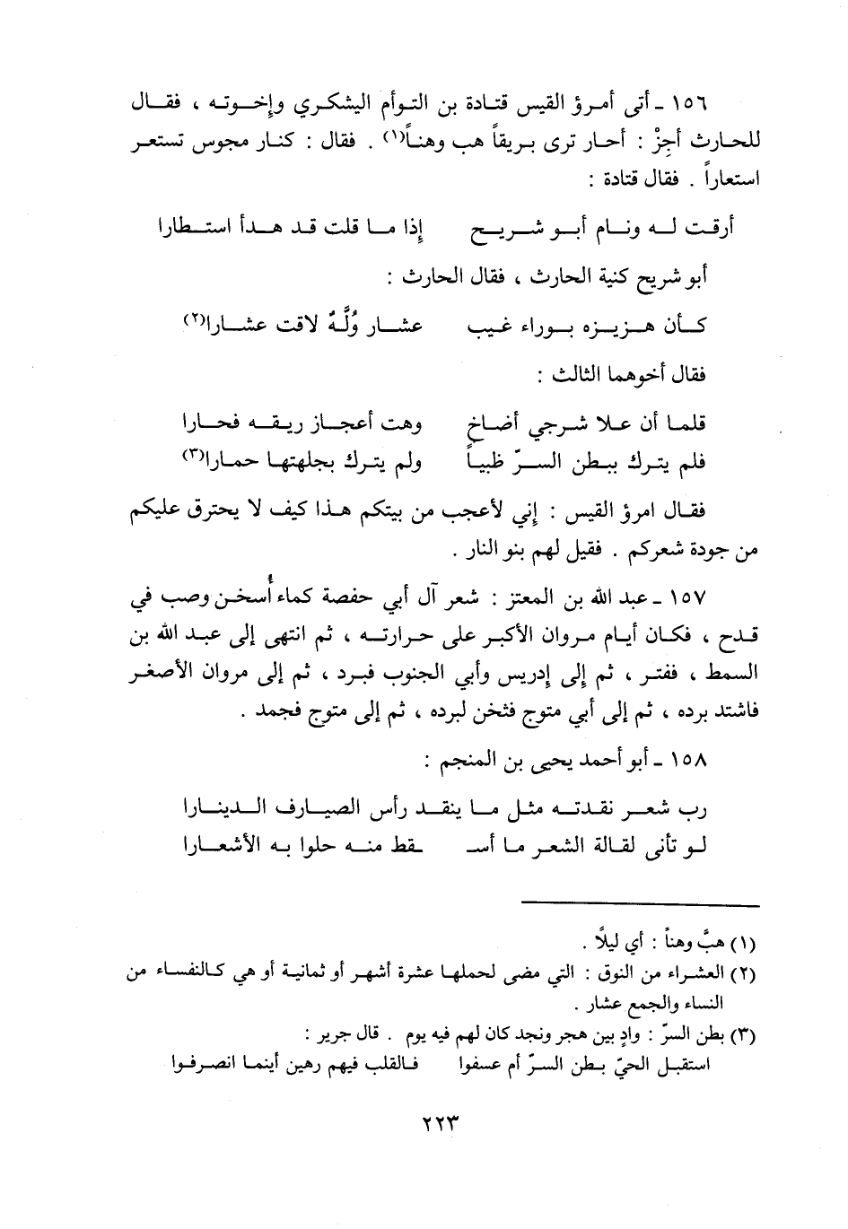 156- أتى أمرؤ القيس قتادة بن التوأم اليشكري وإخوته، فقال للحارث أجز: أحار ترى بريقا هب وهنا «1» . فقال: كنار مجوس تستعر استعارا. فقال قتادة: