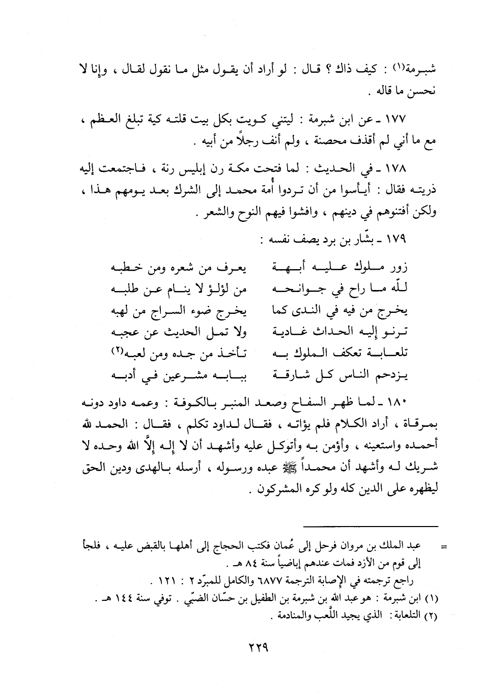 180- لما ظهر السفاح وصعد المنبر بالكوفة: وعمه داود دونه بمرقاة، أراد الكلام فلم يؤاته، فقال لداود تكلم، فقال: الحمد لله أحمده واستعينه، وأؤمن به وأتوكل عليه وأشهد أن لا إله إلّا الله وحده لا شريك له وأشهد أن محمدا صلّى الله عليه وسلّم عبده ورسوله، أرسله بالهدى ودين الحق ليظهره على الدين كله ولو كره المشركون.