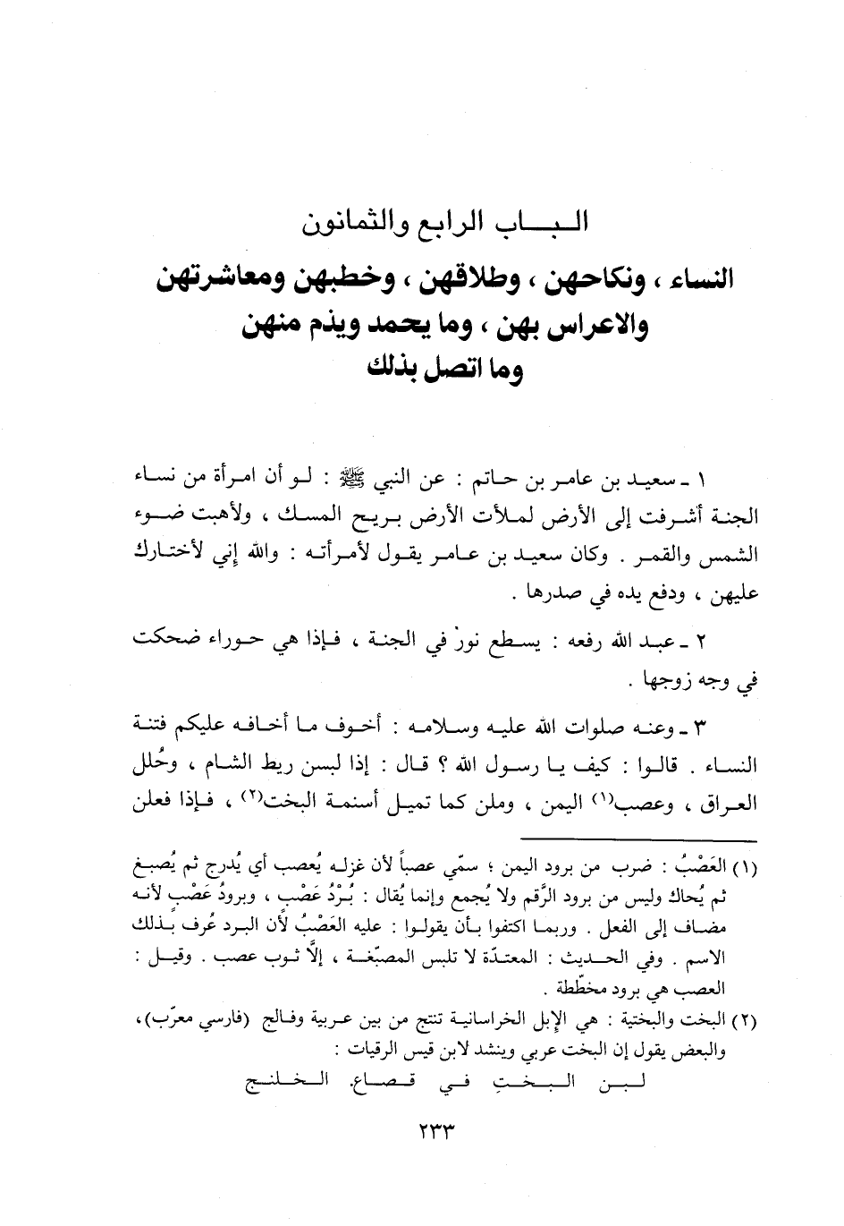 الباب الرابع والثمانون النساء، ونكاحهن، وطلاقهن، وخطبهن ومعاشرتهن والاعراس بهن، وما يحمد ويذم منهن وما اتصل بذلك