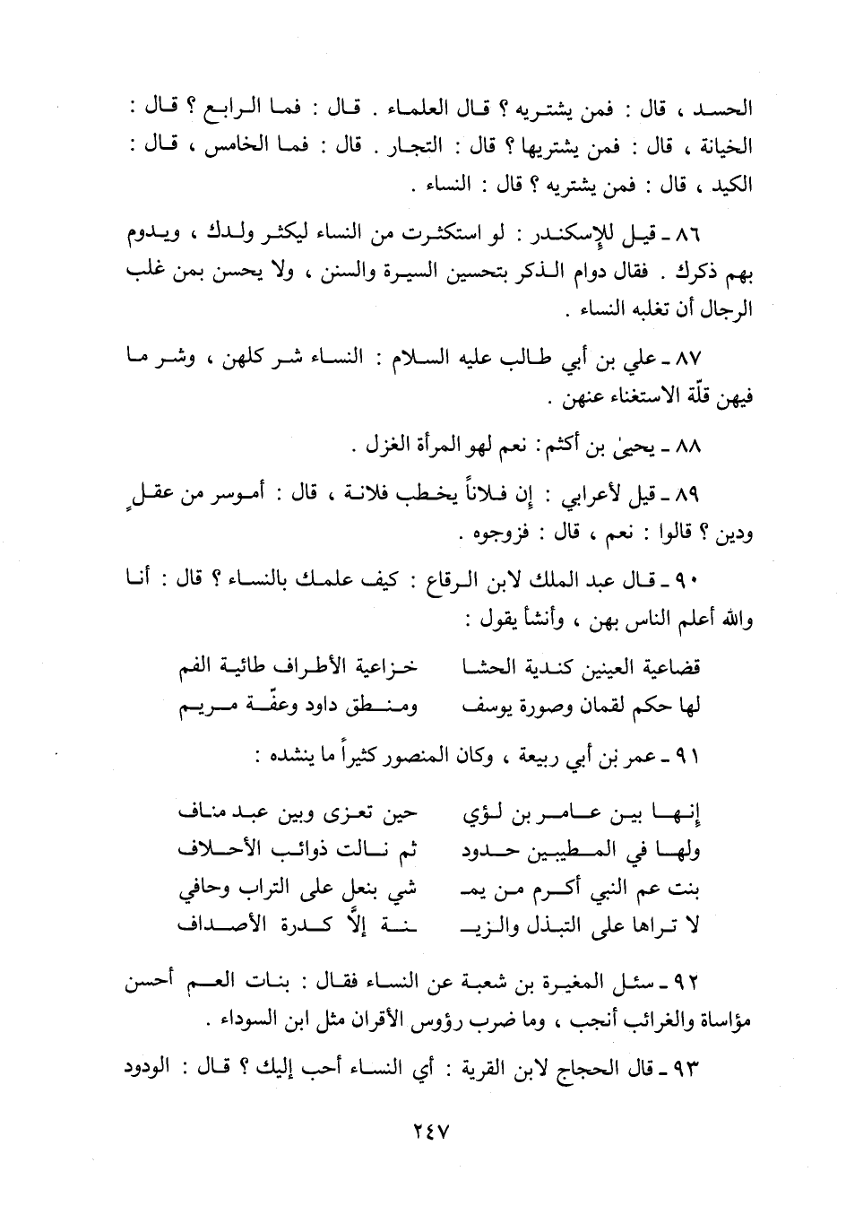 86- قيل للإسكندر: لو استكثرت من النساء ليكثر ولدك، ويدوم بهم ذكرك. فقال دوام الذكر بتحسين السيرة والسنن، ولا يحسن بمن غلب الرجال أن تغلبه النساء.