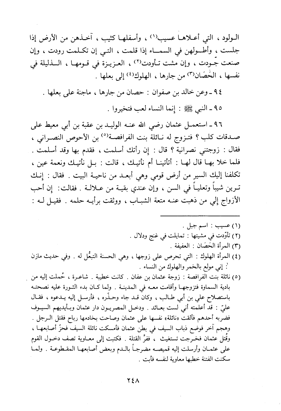 96- استعمل عثمان رضي الله عنه الوليد بن عقبة بن أبي معيط على صدقات كلب؟ فتزوج له نائلة بنت الفرافصة «5» بن الأحوص النصراني، فقال: زوجتني نصرانية؟ قال: إن رأتك أسلمت، فقدم بها وقد أسلمت.