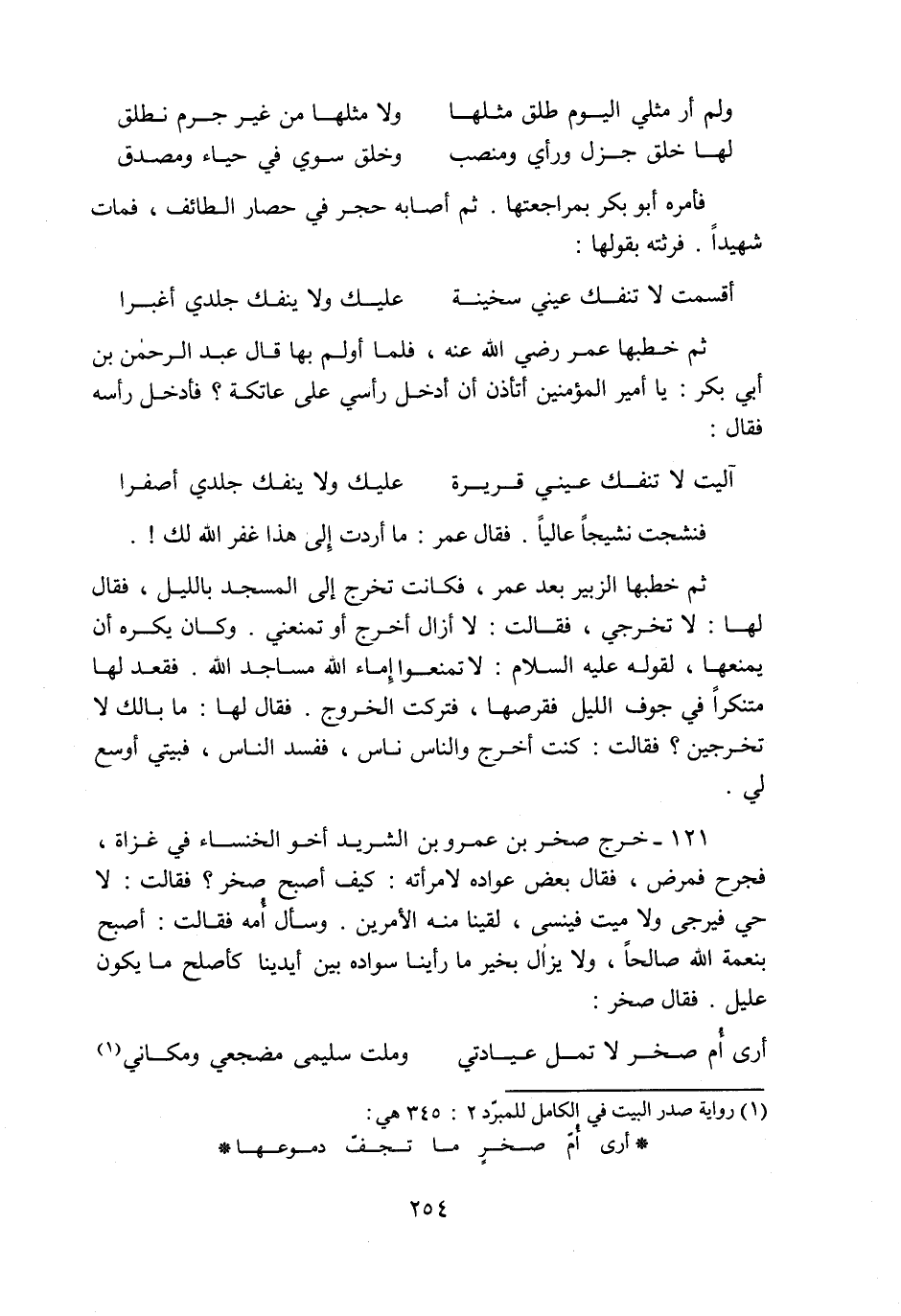 121- خرج صخر بن عمرو بن الشريد أخو الخنساء في غزاة، فجرح فمرض، فقال بعض عواده لامرأته: كيف أصبح صخر؟ فقالت: لا حي فيرجى ولا ميت فينسى، لقينا منه الأمرين. وسأل أمه فقالت: أصبح بنعمة الله صالحا، ولا يزال بخير ما رأينا سواده بين أيدينا كأصلح ما يكون عليل. فقال صخر: