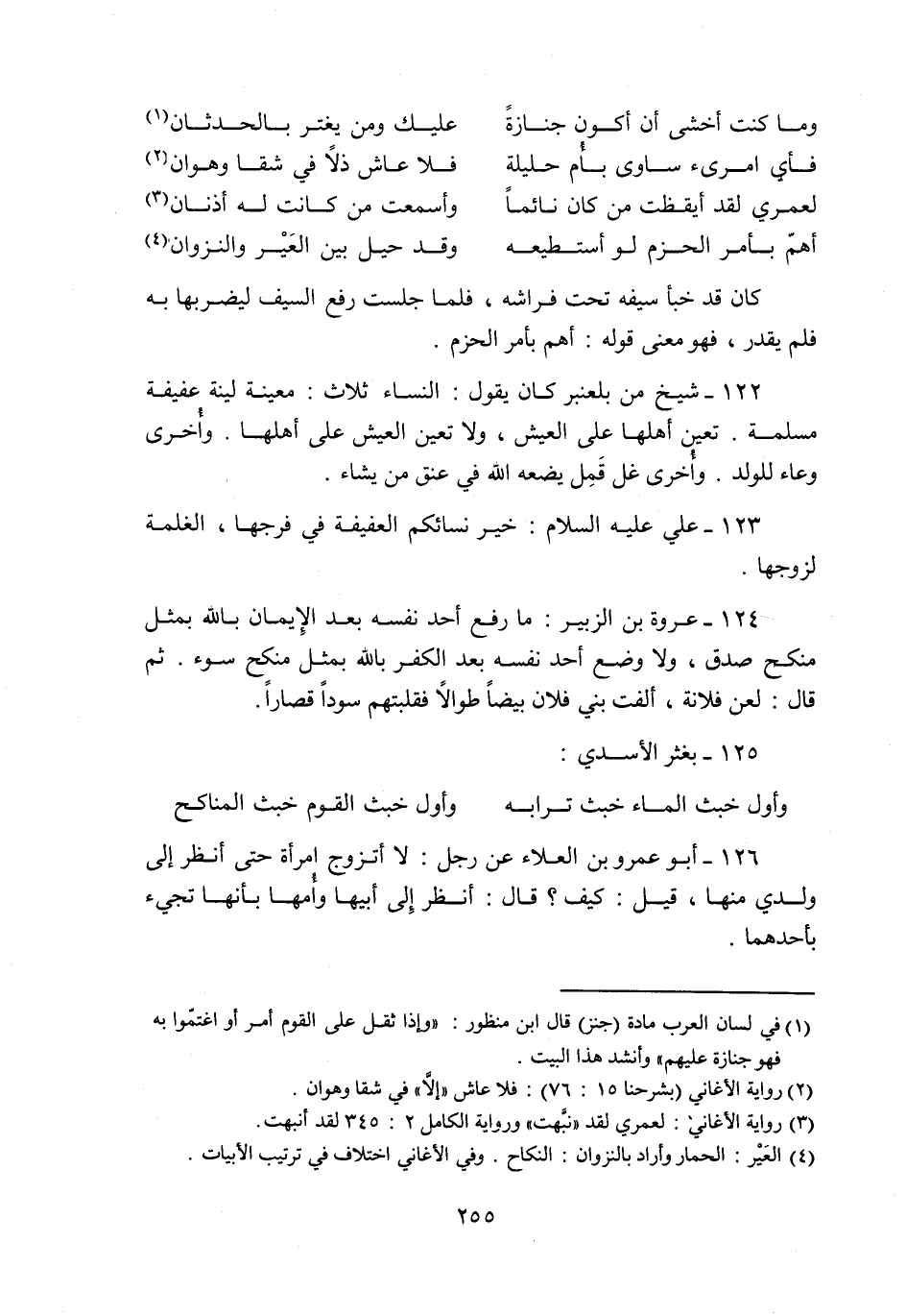 124- عروة بن الزبير: ما رفع أحد نفسه بعد الإيمان بالله بمثل منكح صدق، ولا وضع أحد نفسه بعد الكفر بالله بمثل منكح سوء. ثم قال: لعن فلانة، ألفت بني فلان بيضا طوالا فقلبتهم سودا قصارا.