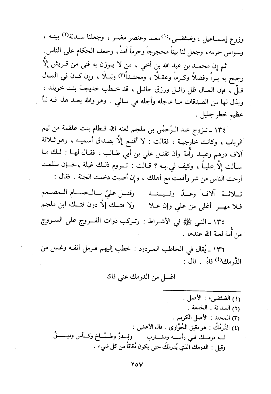 134- تزوج عبد الرّحمن بن ملجم لعنه الله قطام بنت علقمة من تيم الرباب، وكانت خارجية، فقالت: لا أقنع إلّا بصداق أسميه، وهو ثلاثة آلاف درهم وعبد وأمة وأن تقتل علي بن أبي طالب، فقال لها: لك ما سألت إلّا عليا، وكيف لي به؟ قالت: تروم ذلك غيلة، فإن سلمت أرحت الناس من شر وأقمت مع أهلك، وإن أصبت دخلت الجنة. فقال: