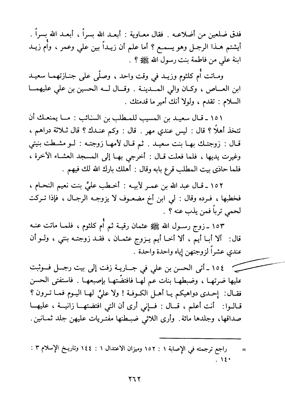 153- زوج رسول الله صلّى الله عليه وسلّم عثمان رقية ثم أم كلثوم، فلما ماتت عنه قال: ألا أبا أيم، ألا أخا أيم يزوج عثمان، فقد زوجته بنتي، ولو أن عندي عشرا لزوجتهن إياه واحدة واحدة.