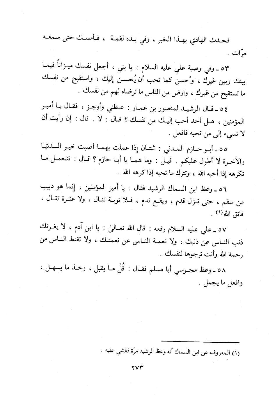 54- قال الرشيد لمنصور بن عمار: عظني وأوجز، فقال يا أمير المؤمنين، هل أحد أحب إليك من نفسك؟ قال: لا. قال: إن رأيت أن لا تسيء إلى من تحبه فافعل.