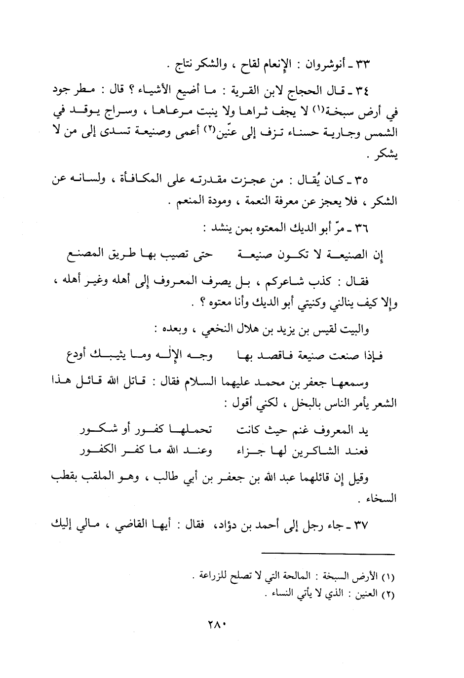 35- كان يقال: من عجزت مقدرته على المكافأة، ولسانه عن الشكر، فلا يعجز عن معرفة النعمة، ومودة المنعم.