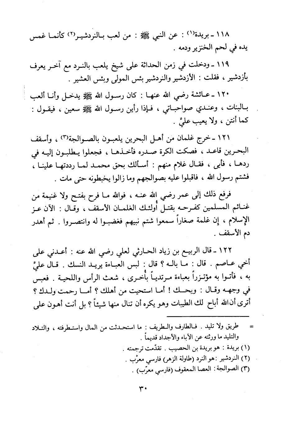 118- بريدة «1» : عن النبي صلّى الله عليه وسلّم: من لعب بالنردشير «2» كأنما غمس يده في لحم الخنزير ودمه.