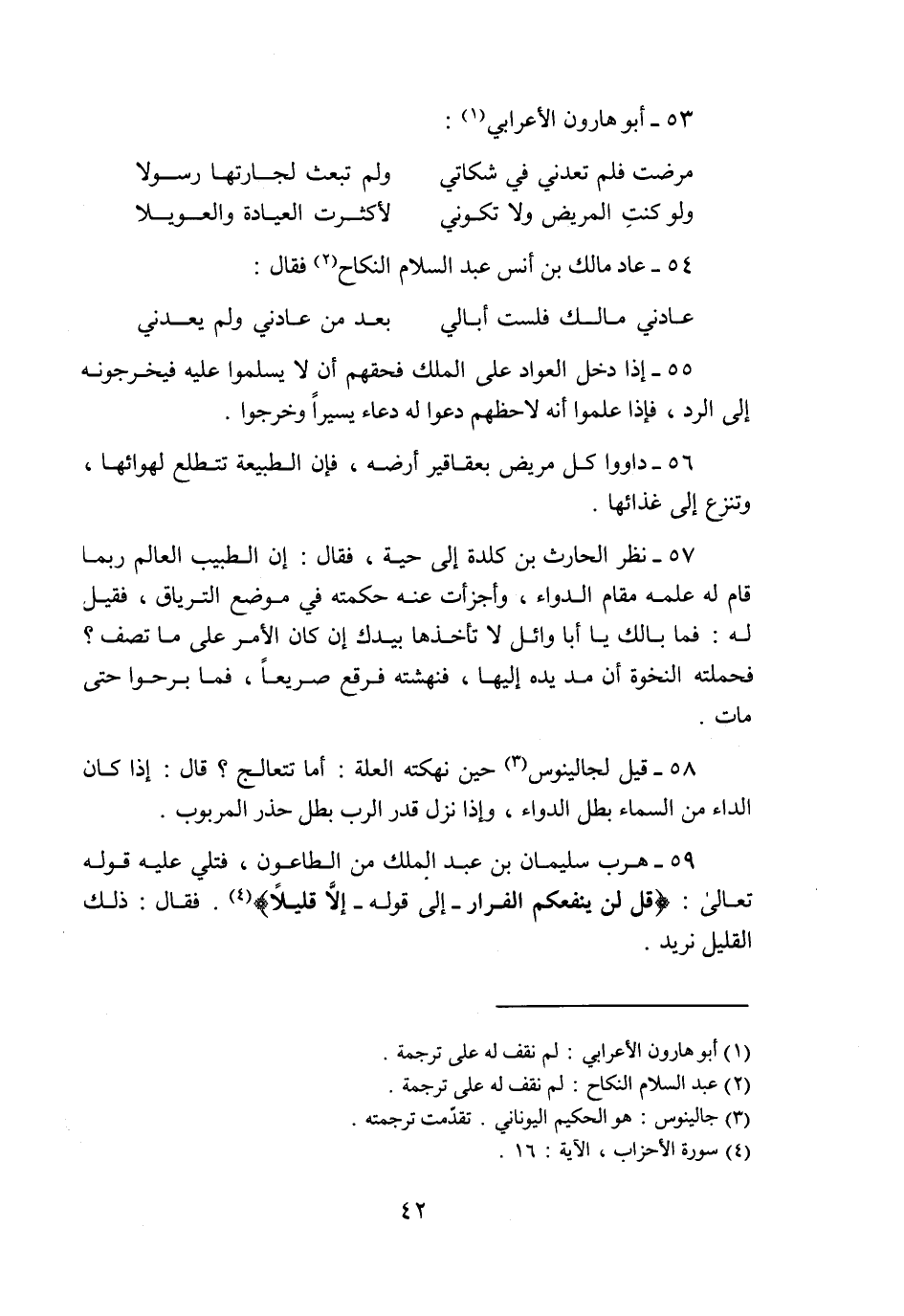58- قيل لجالينوس «3» حين نهكته العلة: أما تتعالج؟ قال: إذا كان الداء من السماء بطل الدواء، وإذا نزل قدر الرب بطل حذر المربوب.