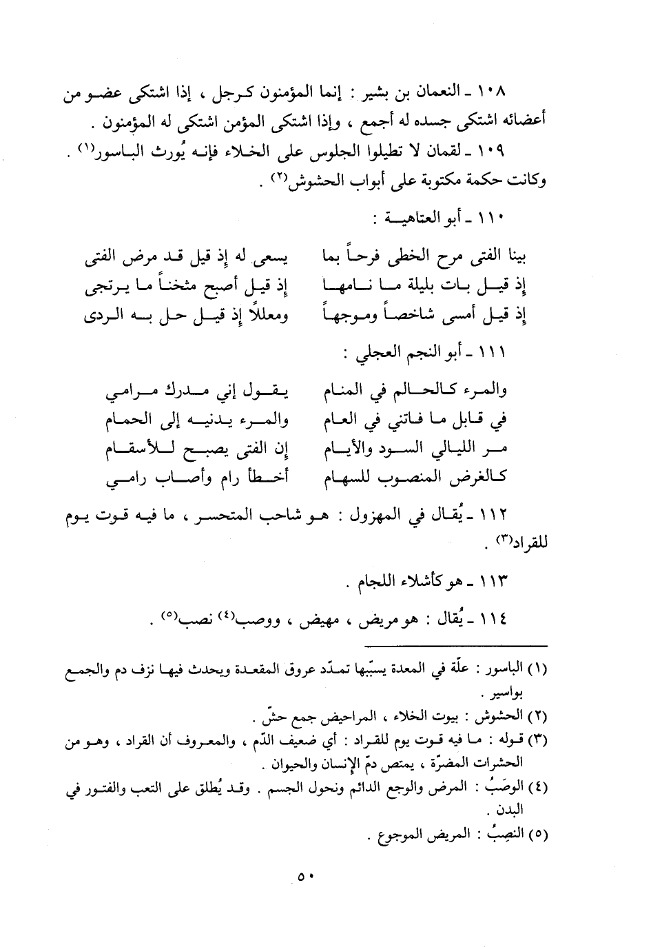 109- لقمان لا تطيلوا الجلوس على الخلاء فإنه يورث الباسور «1» .