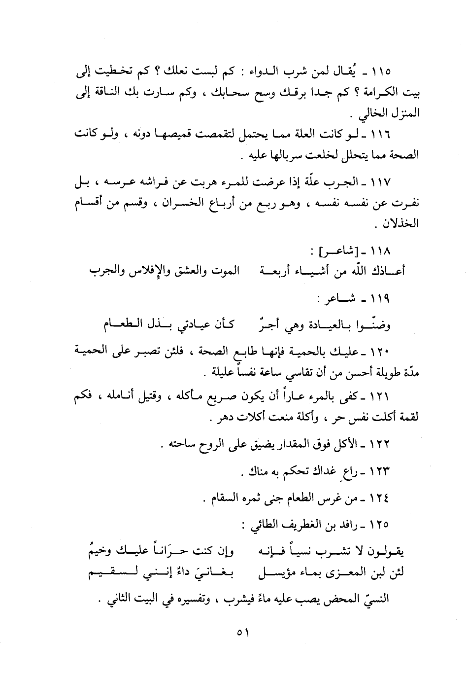 115- يقال لمن شرب الدواء: كم لبست نعلك؟ كم تخطيت إلى بيت الكرامة؟ كم جدا برقك وسح سحابك، وكم سارت بك الناقة إلى المنزل الخالي.
