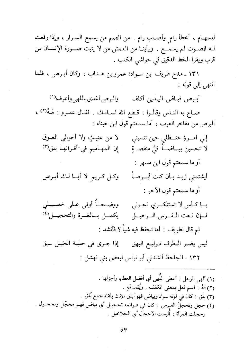 131- مدح طريف بن سوادة عمرو بن هداب، وكان أبرص، فلما انتهى إلى قوله: