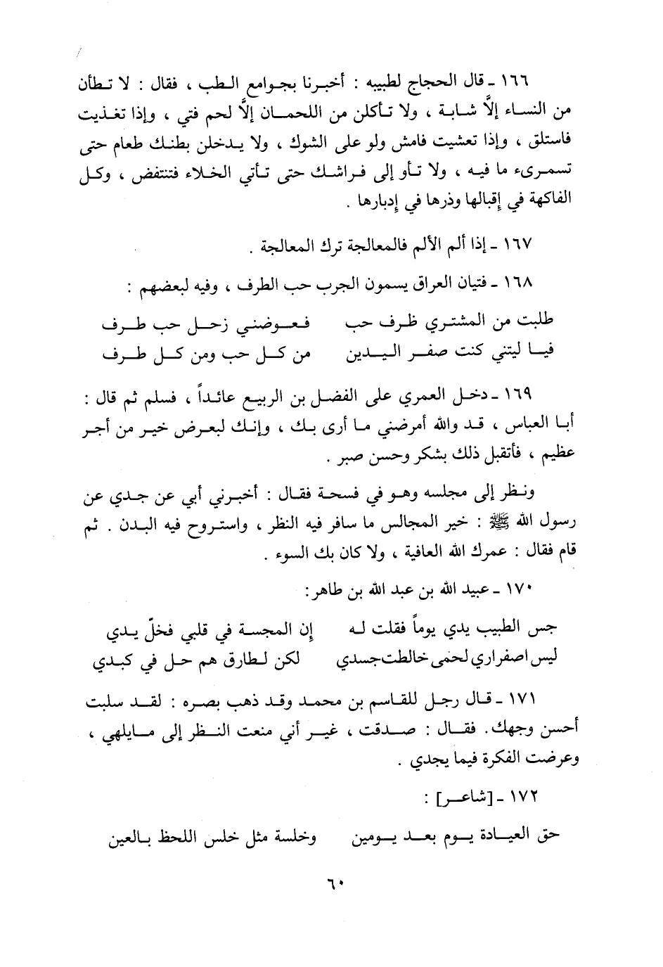 166- قال الحجاج لطبيبه: أخبرنا بجوامع الطب، فقال: لا تطأن من النساء إلّا شابة، ولا تأكلن من اللحمان إلّا لحم فتي، وإذا تغذيت فاستلق، وإذا تعشيت فامش ولو على الشوك، ولا يدخلن بطنك طعام حتى تسمرىء ما فيه، ولا تأو إلى فراشك حتى تأتي الخلاء فتنتفض، وكل الفاكهة في إقبالها وذرها في إدبارها.