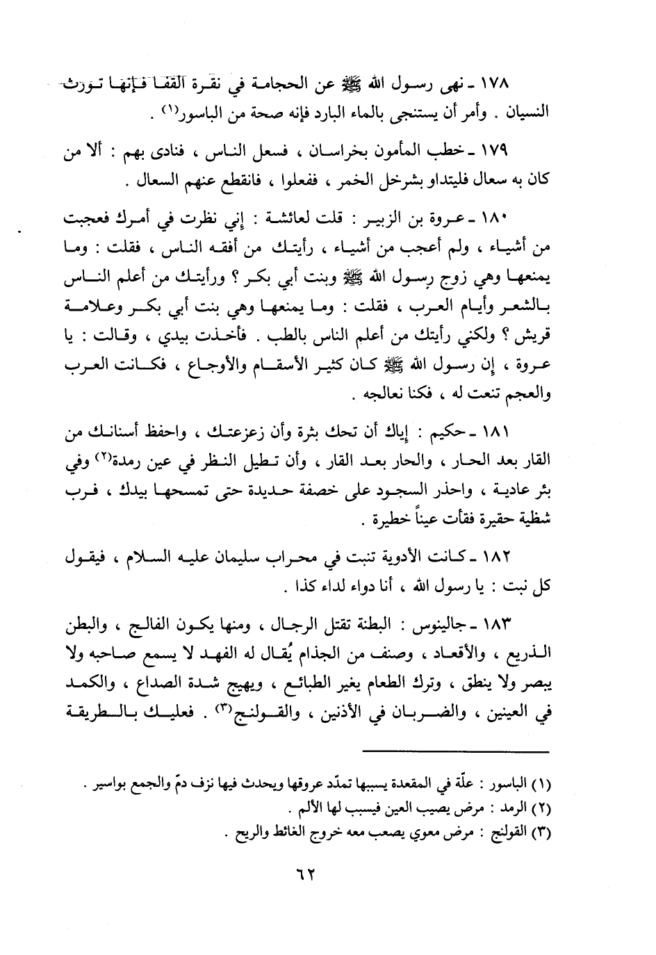 178- نهى رسول الله صلّى الله عليه وسلّم عن الحجامة في نقرة القفا فإنها تورث النسيان. وأمر أن يستنجى بالماء البارد فإنه صحة من الباسور «1» .