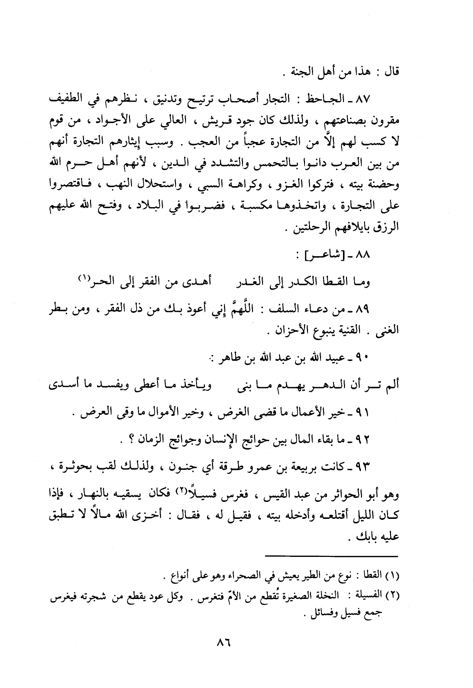 87- الجاحظ: التجار أصحاب ترتيح وتدنيق، نظرهم في الطفيف مقرون بصناعتهم، ولذلك كان جود قريش، العالي على الأجواد، من قوم لا كسب لهم إلّا من التجارة عجبا من العجب. وسبب إيثارهم التجارة أنهم من بين العرب دانوا بالتحمس والتشدد في الدين، لأنهم أهل حرم الله وحضنة بيته، فتركوا الغزو، وكراهة السبي، واستحلال النهب، فاقتصروا على التجارة، واتخذوها مكسبة، فضربوا في البلاد، وفتح الله عليهم الرزق بايلافهم الرحلتين.